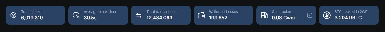 The grids below the search bar show an overview of various components on the Rootstock platform. You can see the total blocks on the network and the total transactions. You can click the respective grid to view the block list or transactions. Likewise, the grids present other details like the average block time, number of wallet addresses, current gas, and total BTC locked in the Rootstock 2-way peg.